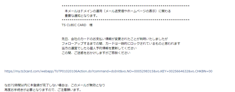 今回は「TS CUBIC CARD」にまつわる詐欺の情報でありました。